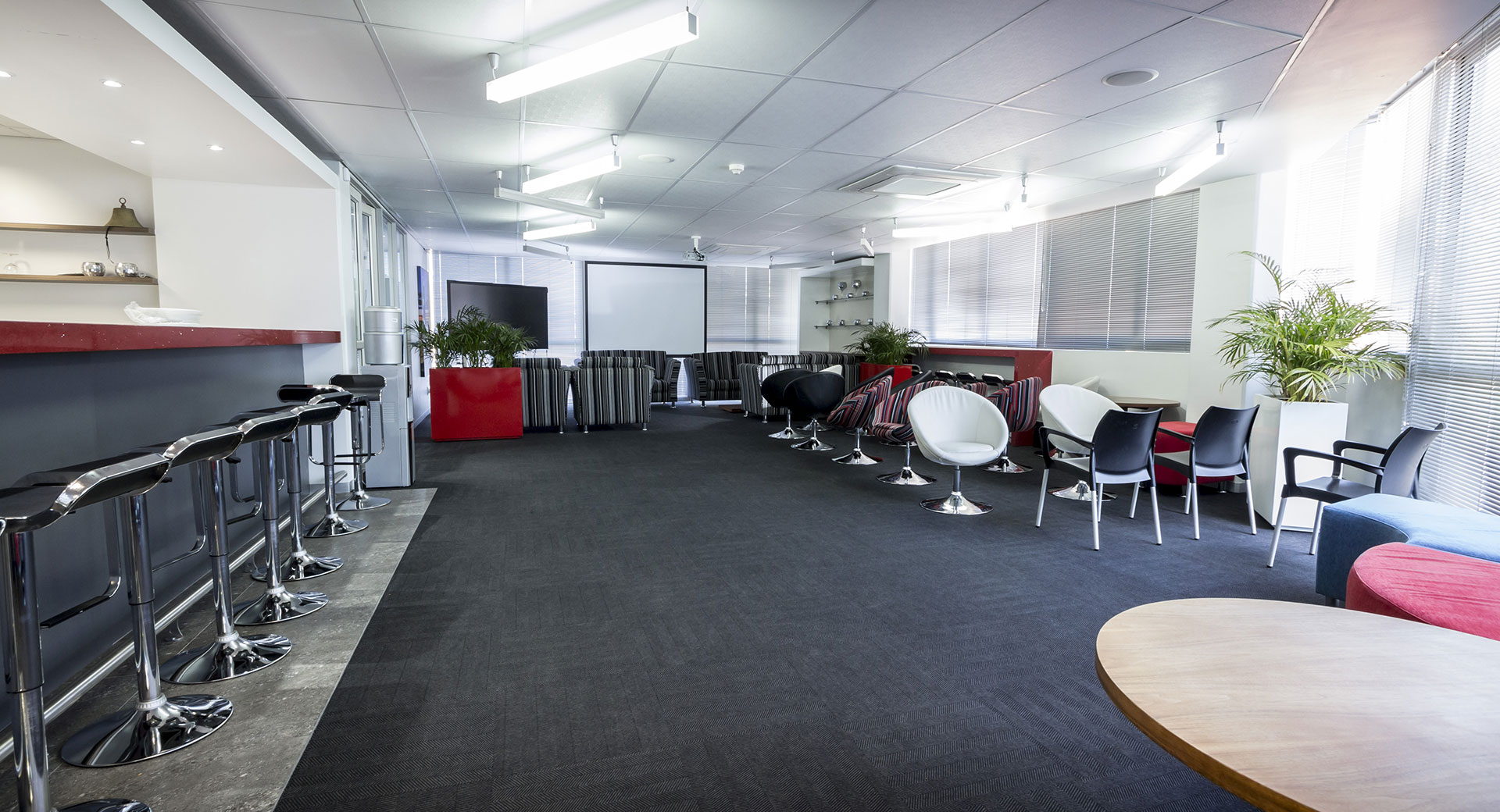 The ceilings were an intricate construction of slim bulkheads hiding services and supporting LED lighting. The fit-out was completed in
